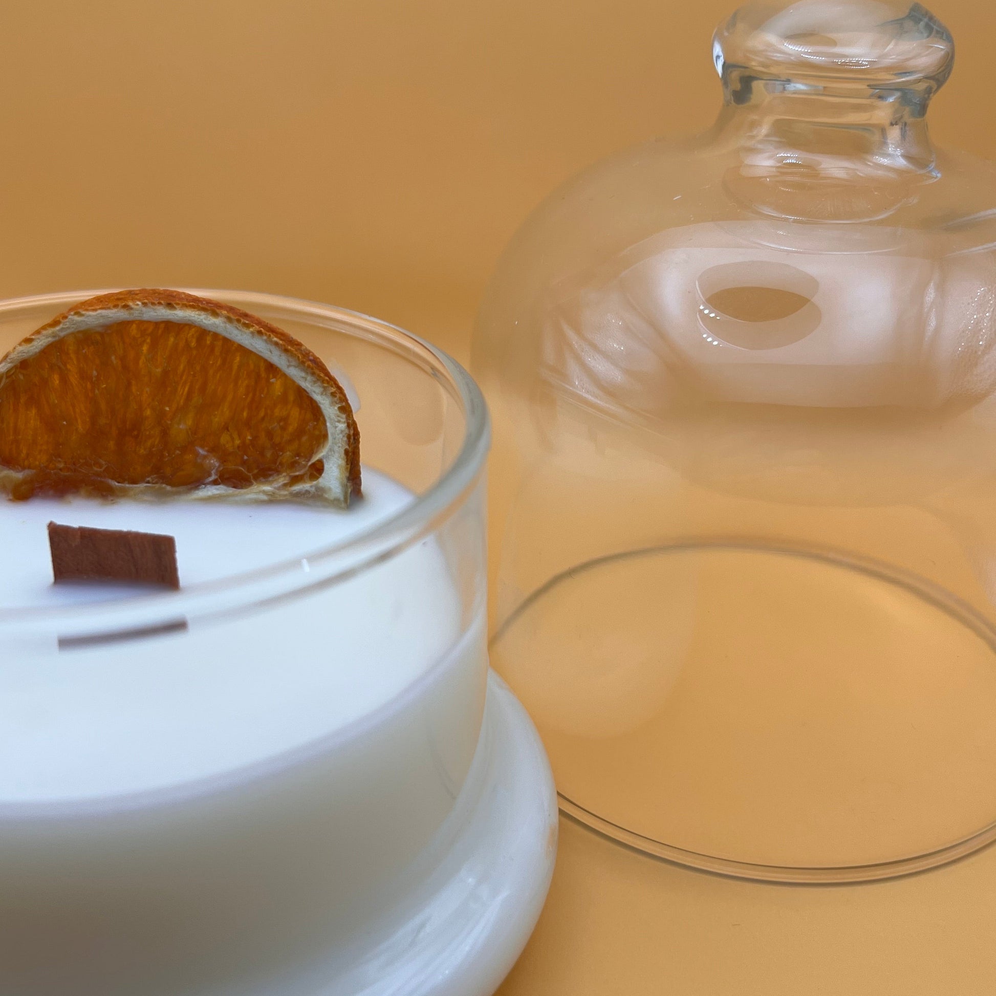 Hand-poured with care and love, this candle comes in a glass cloche that makes it feel extra special. Decorated with a dried orange slice, it has a simple, natural charm. Perfect to warm up your home or to gift to someone you love!